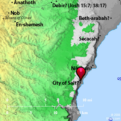 Atlas ![]() City of Salt and surrounding area Maps Created using Biblemapper 3.0 Additional data from OpenBible.info Occurrences Joshua 15:62 Nibshan, the City of Salt, and En Gedi; six cities with their villages.Encyclopedia SALT, CITY OF(`ir ha-melach; Codex Alexandrinus hai pol (e)is halon): One of the six cities in the wilderness of Judah mentioned between Nibshan and Engedi (Joshua 15:62). The site is very uncertain. The large and important Tell el-Milch (i.e. "the salt hill"), on the route from Hebron to Akaba, is possible. |