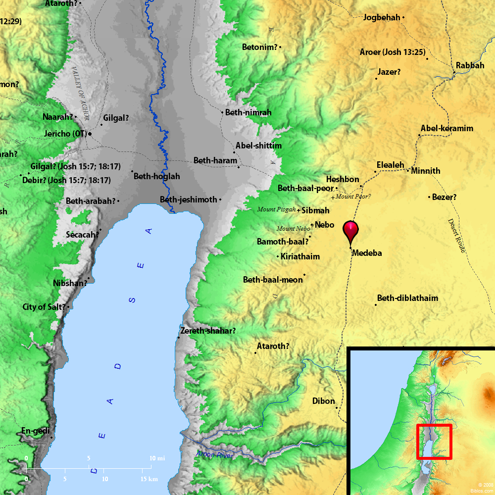 Atlas ![]() Medeba and surrounding region Maps Created using Biblemapper 3.0 Additional data from OpenBible.info Occurrences Numbers 21:30 We have shot at them. Heshbon has perished even to Dibon. We have laid waste even to Nophah, Which reaches to Medeba."Joshua 13:9 from Aroer, that is on the edge of the valley of the Arnon, and the city that is in the middle of the valley, and all the plain of Medeba to Dibon; Joshua 13:16 Their border was from Aroer, that is on the edge of the valley of the Arnon, and the city that is in the middle of the valley, and all the plain by Medeba; 1 Chronicles 19:7 So they hired for themselves thirty-two thousand chariots, and the king of Maacah and his people, who came and encamped before Medeba. The children of Ammon gathered themselves together from their cities, and came to battle. Isaiah 15:2 They have gone up to Bayith, and to Dibon, to the high places, to weep. Moab wails over Nebo and over Medeba. Baldness is on all of their heads. Every beard is cut off. Encyclopedia MEDEBAmed'-e-ba (medhebha'; Maidaba, Medaba): The name may mean "gently flowing water," but the sense is doubtful. This city is first mentioned along with Heshbon and Dibon in an account of Israel's conquests (Numbers 21:30). It lay in the Mishor, the high pastoral land of Moab. The district in which the city stood is called the Mishor or plain of Medeba in the description of the territory assigned to Reuben (Joshua 13:9), or the plain by Medeba (Joshua 13:16). Here the Ammonites and their Syrian allies put the battle in array against Joab, and were signally defeated (1 Chronicles 19:7). This must have left the place definitely in the possession of Israel. But it must have changed hands several times. It was taken by Omri, evidently from Moab; and Mesha claims to have recovered possession of it (M S, ll. 7, 8, 29, 30). It would naturally fall to Israel under Jeroboam II; but in Isaiah 15:2 it is referred to as a city of Moab. It also figures in later Jewish history. John, son of Mattathias, was captured and put to death by the Jambri, a robber tribe from Medeba. This outrage was amply avenged by Jonathan and Simon, who ambushed a marriage party of the Jambri as they were bringing a noble bride from Gabbatha, slew them all and took their ornaments (1 Maccabees 9:36;; Ant, XII, i, 2, 4). Medeba was captured by Hyrcanus "not without the greatest distress of his army" (Ant., XIII, ix, 1). It was taken by Janneus from the Nabateans. Hyrcanus promised to restore it with other cities so taken to Aretas in return for help to secure him on the Judean throne (ibid., xv, 4; XIV, i, 4). Ptolemy speaks of it as a town in Arabia Petrea, between Bostra and Petra. Eusebius and Jerome knew it under its ancient name (Onomasticon, under the word). It became the seat of a bishropric, and is mentioned in the Acts of the Council of Chalcedon (451 A.D.), and in other ecclesiastical lists. MED'EBA, 13 1/2 ms. e. of the n. end of the Dead Sea now only ruins, with an immense ancient cistern for water. Strong's Hebrew H4311: Medebaa city in Moab |