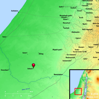 Atlas ![]() Ashan and surrounding region Maps Created using Biblemapper 3.0 Additional data from OpenBible.info Occurrences Joshua 15:42 Libnah, Ether, Ashan,Joshua 19:7 Ain, Rimmon, Ether, and Ashan; four cities with their villages; 1 Chronicles 4:32 Their villages were Etam, and Ain, Rimmon, and Tochen, and Ashan, five cities; 1 Chronicles 6:59 and Ashan with its suburbs, and Beth Shemesh with its suburbs; Encyclopedia ASHANa'-shan (`ashan): An unknown site in the domain of Judah (Joshua 15:42), possessed by Simeon (Joshua 19:7), and mentioned among the priests' cities in 1 Chronicles 6:59. (44) = Joshua 21:16 (`ayin is a corruption of `ashan). Chorashan (or Borashan), which was probably the site of some reservoir in the Southwest part of Judah (1 Samuel 30:30), is the same as Ashan. Strong's Hebrew H6228: Ashana place in Judah and later in Simeon |